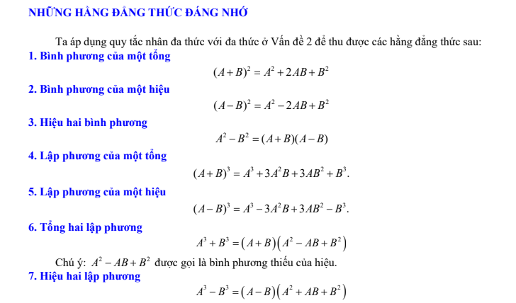 Trong phần lý thuyết các em sẽ được ôn tập lại nội dung của 2 phần: Đại số và Hình học. Ở phần Đại số chúng ta sẽ nhắc lại những kiến thức trọng tâm như: Những hằng đẳng thức đáng nhớ